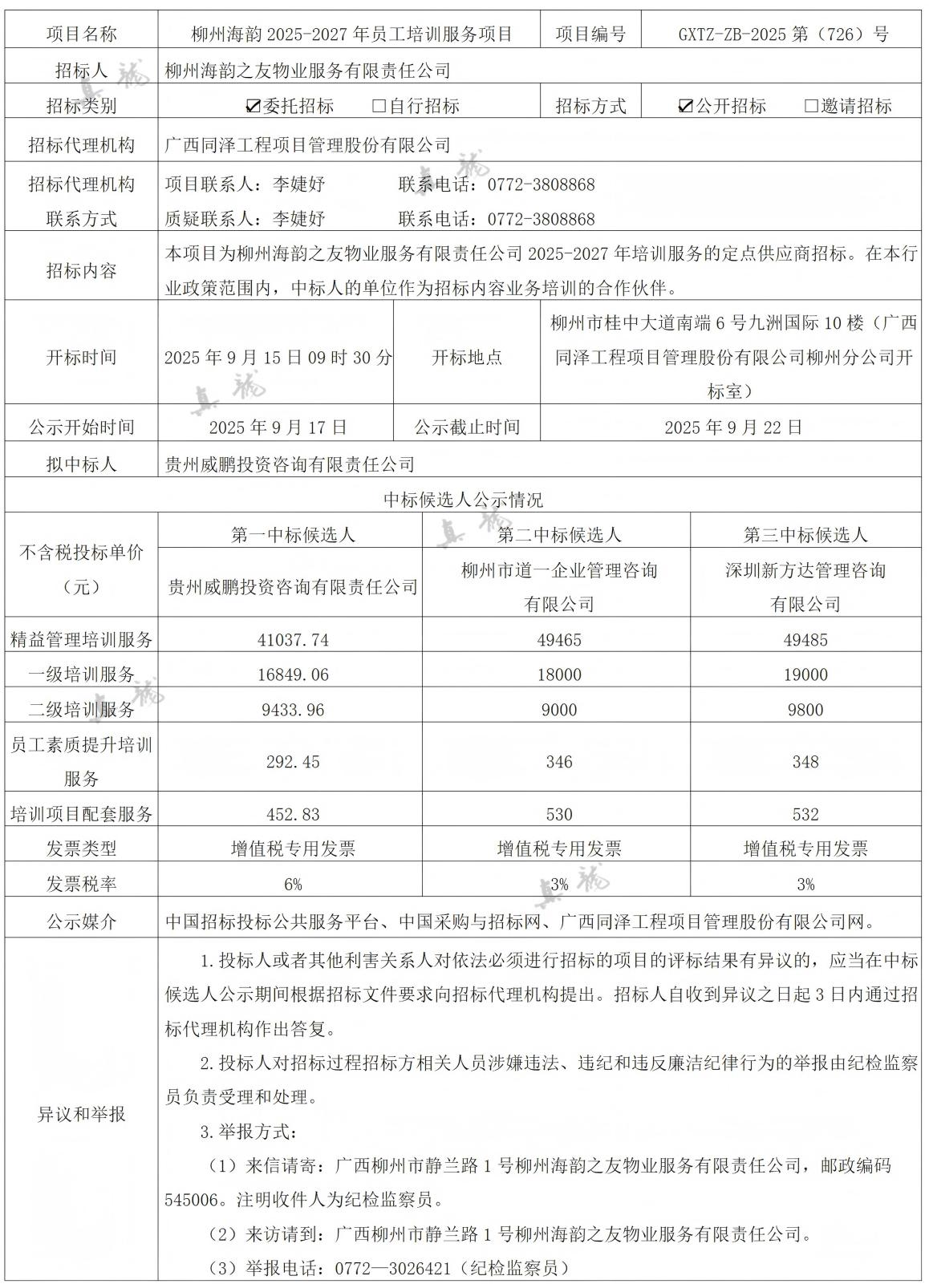 柳州海韻之友物業(yè)服務(wù)有限責任公司柳州海韻2025-2027年員工培訓服務(wù)項目(項目編號:GXTZ-ZB-2025第(726)號)中標候選人公示